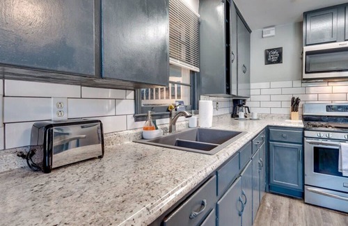 Upon arrival, you will find a parking pad outside the screened-in patio. After you have parked, you will access the home through the patio to enter the house. Once inside, you will be greeted by our open concept living area. You will have access to a 70" TV complete with Roku in the living room. Multiple couches (including a queen-sized sleeper sofa) ensure plenty of space to relax and chill out. The dining room is connected to both the living room and the kitchen. It has an oversized farmhouse-style table with benches and chairs. This table easily seats 8 adults comfortably. Our kitchen is newly updated with stainless steel appliances and the basics you will need to settle in and feel "at home." With 5 generously sized bedrooms, there should be plenty of room for large families or groups to find a space that fits their needs. Bedroom #1 has a king-sized bed with an additional queen-sized sleeper sofa. This room serves as the master suite and has its own bathroom and an additional 50" TV complete with Roku. Bedroom #2 is perfect for the kids! With two twins over full bunk beds, you can comfortably sleep 6 kids in this room! Bedroom #3 has a queen-sized bed and shares a jack-n-jill bathroom with bedroom #4 with two full-size beds. Bedroom #5 rounds out the sleeping arrangements with a king-size bed. Our home has 3 full bathrooms, a washer and dryer on-site, and a wonderful covered porch complete with a bar, lots of seating, and plenty of fun and games for all ages! While our house does have a wheel chair ramp our house is NOT ADA compliant. Guests will not have to navigate any stairs with exception to the master suite which has two steps leading down into the room. Please do not hesitate to reach out with any questions you may have about our home! We look forward to hosting you! We have a community game area with a great deal of seating and a grill. It also consists of different games such as volleyball, corn hole, ladder toss, and more!
