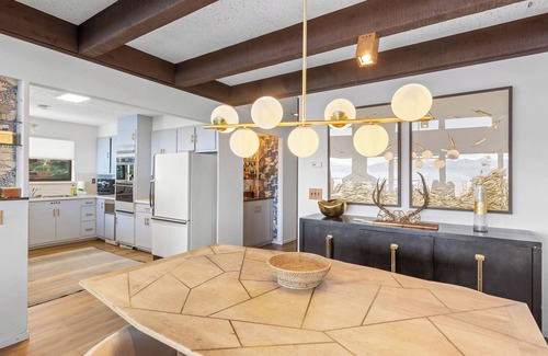 The main floor features a cozy entryway and a spacious primary bedroom with an ensuite bathroom and a convenient work desk. A majestic freestanding fireplace adds to the nostalgic ambiance, creating a comfortable retreat for relaxation. The vintage-inspired living area boasts a wet bar connected to the classic kitchen and dining space, perfect for preparing and enjoying meals together.