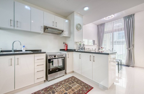 Find an oasis of peace and calmness in our family-friendly townhouse in Damac Hills 2. This two-story property is ideal for both families and groups’ short and long-term stays. The open living concept and wide dining space promote family togetherness. The backyard garden is a great place to unwind alone or hangout with friends. The bedrooms upstairs each have different motifs but guarantee the same thing: uninterrupted rest. This home was designed by our team to provide you comfort, convenience, and safety. You will undoubtedly enjoy your time in Albizia’s peaceful community.