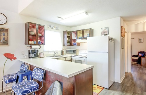 This vibrant interior features a spacious, open living area and strong natural lighting. A sunny, enclosed porch is ideal for morning coffee or afternoon reading. The kitchen is well-equipped for home meal planning and includes a dishwasher for easy cleanup. Additional perks include central air-conditioning and free WiFi.