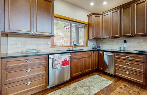 Step into this incredible hideaway and be greeted by multiple sunlit, open-concept living areas complete with high ceilings, an expansive balcony, and artful decor. Enjoy your morning coffee on the deck while taking in the views or snuggle up by the fire with some cocoa. A well-appointed kitchen boasts stainless steel appliances and gleaming countertops for effortless food preparation. Share home-cooked meals at the adjacent dining table and then break out the board games. There’s even a fully outfitted desk space for those hoping to get a little work done vacation-style. The bedrooms are extra inviting with cozy linens, a fireplace, and luxe accents, while the primary en suite bath is spacious and spa-like for ultimate comfort. After a fun day of mountain adventure, indulge in a rejuvenating soak in the private hot tub and let the starlight overhead illuminate another magical day.