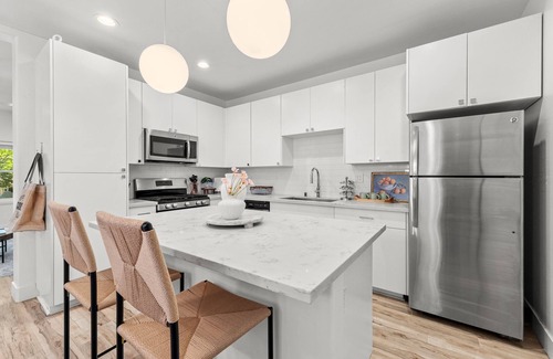 Fully equipped with modern stainless steel appliances, granite countertops, and a breakfast bar.