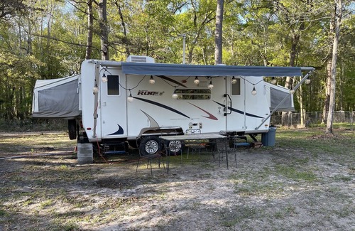 Property is a 23 foot hybrid camper with 2 pop out queen beds. Camper also offers a couch that flips out to a full size bed, along with the dinning room table that can be turned into a bed as well. Camper offers a kitchen that includes a 3 gas stove top with oven, microwave, toaster and coffee maker. Bathroom with stand up shower. There is a TV with surround sound that includes Netflix and a few other services too.