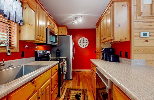 Featuring sunlit interiors, vaulted ceilings, and plenty of rustic charm, this hideaway boasts cozy living spaces and comfortable amenities. A well-equipped kitchen, complete with modern appliances, gleaming countertops, and a large adjacent dining table makes gathering for home-cooked meals a breeze. Or use the outdoor grill and share laughs on the wraparound deck, taking in the warm evening air. After a full day of mountain adventure, snuggle up by the fireplace for family movie night or challenge a friend to a foosball tournament in the well-furnished game room. Even better, unwind by the firepit for s’mores under the stars and create unforgettable vacation memories.