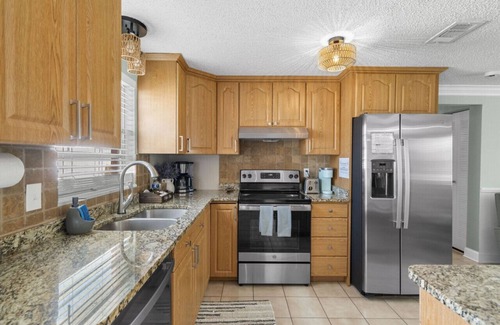 Inside, find a welcoming atmosphere that effortlessly combines comfort and convenience. The well-equipped kitchen is perfect for preparing meals for loved ones. Additionally, a welcoming coffee and tea station awaits you, ensuring a warm reception upon your arrival. Tranquil tropics provide all the comforts of home and more! When staying with us you can expect to find provided comforts such as shampoo, conditioner + body wash, comfortable sleeping arrangements, beach/pool towels and a fully equipped kitchen, including a snow cone machine!