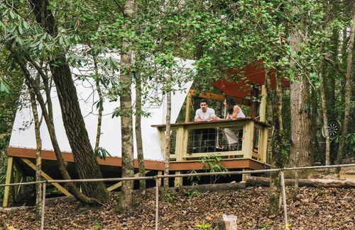 The Fire Pod offers guests a one-of-a-kind custom glamping experience. Romance, desire and energy align to kindle and connect here. The villa in the forest is a custom canvas, wood and steel structure with a queen sized hearth-bed and fireplace, an adorable outdoor living space, and flaunts lavish and artistic style It's very to the bath house, indoor & outdoor kitchens, games and wellness amenities.