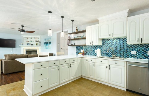 As you step inside, you'll be greeted by a homey interior that seamlessly blends modern comforts with vintage charm. The open floor plan creates a welcoming atmosphere, with a cozy breakfast bar, ceiling fans, and high-speed internet in the living area. The kitchen is fully equipped with solid surface counters and everything you need to prepare delicious meals during your stay.