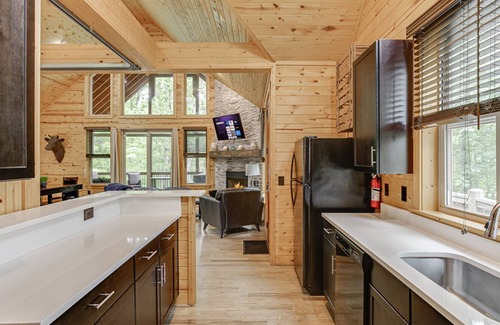 Brand New Pod Design. Tranquility is modeled after the Oasis cabin but better. Please note that although we have called this a 2 bedoom, it could be considered a 4 bedroom "open Design" as it has 4 sleeping areas. We have taken all the features of our luxurious one bedroom luxury cabin and made it twice as good by building out the lower level. The main bedroom has large barn doors that open when privacy in the upstairs bedroom is desired. There is also a large dining area and we have moved the pool table down to the lower level. The downstairs has an all open feel with 2 king size pod beds and 2 twin size bunk pods. It has a full size pool slate pool table and is set up ideal to watch the big games on the 55" tv. It also has a balsa wood infrared sauna. The finishes are all high end white quartz counter tops, marble, stacked rock fireplace and mosaic tile. The floors are solid wood and the basement has a tile wood look. Tranquility is perched up on a hill and gives a completely private feel in this very private gated cabin community. With this cabins unique design, it easily will sleep 8 with 5 separate sleeping areas. Two upstairs on the king bed and 6 down on the 2 king pods and 2 twin bunk pods.