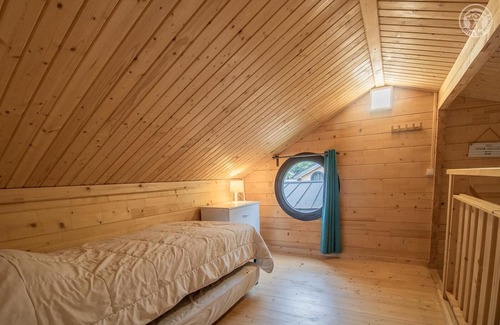 Individual chalet. Access by a few steps. Ground floor: Living room-kitchen, separate toilet, bathroom (shower), 2 bedrooms (1 double bed 140x190 cm / 2 single beds 90x190 cm). 1st floor: mezzanine (2 single beds 90x190 cm), 1 bedroom (2 single beds 90x190 cm), separate WC. terrace. Accommodation under slope on the 1st floor. Collective barbecue in the campsite. Contemporary wooden chalet benefiting from a beautiful exposure 10 minutes from the Savière lock and the Rhône. Quality immediate environment. Beautiful shaded terrace. Private outdoor space in front of the chalet.