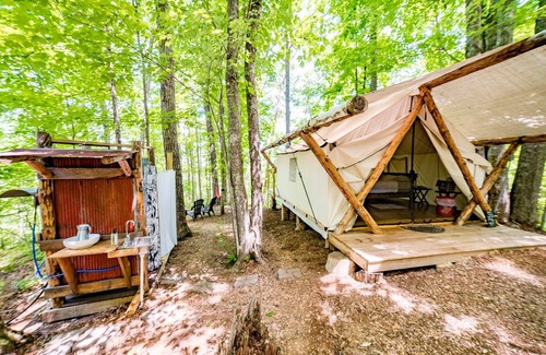 Located on private land away from the crowds of town. Your glamping tent is set on an untouched mountaintop, surrounded by magnificent trees.tranquil glamping retreat. Our goal is to provide guests with a unique "experience", one that a stay in a cabin can not provide.....tranquility, a connection with ones self and nature, and more. We realize this experience isn't for everyone, but if you're looking for a true adventure and some peace, we'd love to host you! Please see our profile for more information about us, and to read over 400 positive, 5 star reviews!