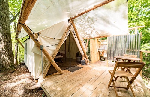 Located on private land away from the crowds of town. Your glamping tent is set on an untouched mountaintop, surrounded by magnificent trees.
