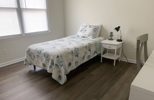 With 1075 sf to yourself, you’ll have the entire space including 2 bedrooms, 1 full bath upstairs, and 1 half bath, living area, full kitchen/dinette downstairs, with back fenced patio. Your space includes a queen bed in master, second bedroom with twin bed and a desk/workspace. A quiet wooded community, with only 2 turns out of the complex to take you to ECU Medical!