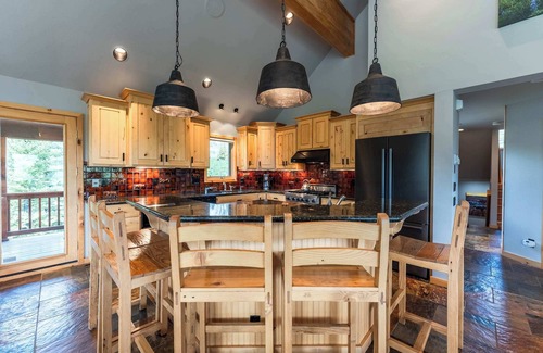 On the main floor there is one bedroom with a Queen bed and bathroom. The oversized bathroom has a steam shower. The expansive, vaulted living room and fully stocked chef's kitchen are also located on this level. The spacious gourmet kitchen has Bosch and Viking appliances, granite countertops, 2 dishwashers and is fully stocked with all the cooking and serving dishes you may need. There is ample room for all convene at the dining table for family style meals. The large leather sofa comfortably seats up to 8 adults. This room also offers a beautiful stone, gas fireplace and comfortable seating which makes it unbelievably cozy year around. The large west facing deck just off of the living space has a grill, table and seating for eight creating a place for a meal with an incredible view! Sunset, anyone?