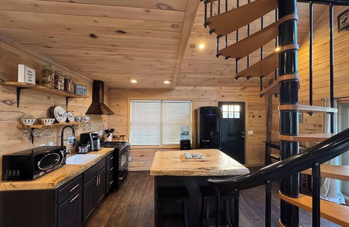 MoonLight, just steps away, feels like a rustic dream — rich wood floors, a grand king-size bed downstairs, and a cozy queen loft above. The kitchen here is dark and elegant, with open shelving and deep wood counters made for morning coffee rituals and late-night glasses of wine. Curl up by the stone fireplace, share laughter around the farmhouse table, and let the days unfold at their own sweet pace.