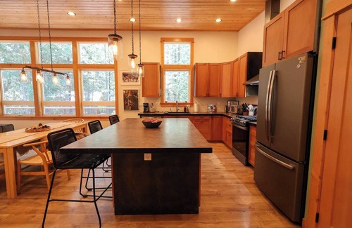Treehouse is a modern cabin near Mazama, nestled among pines, with easy access to the Methow Trail and river. Bedrooms sleep 8 with a king bedroom, bunkroom, queen room, in addition there is a flex space with a pullout sofa, sleeping 2, and desk. The open-plan living area upstairs includes a full kitchen and large windows. Starlink internet is provided. Dogs are allowed with prior approval and a nightly fee. It's a peaceful base for exploring the Methow Valley year-round.