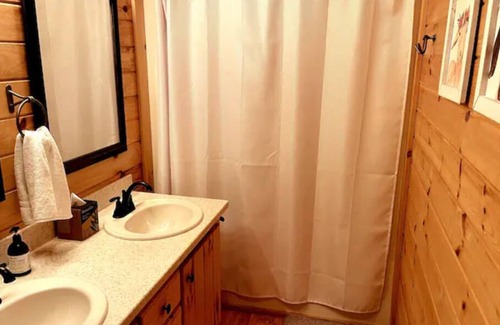 Full wraparound deck offers outdoor chairs, cornhole, gas fire pit, and gas grill. Stand-alone screen house has fireplace, Smart TV, and bar area. Nearby are a stone fire pit (bring your own wood) and covered hot tub area. Inside, you'll find an open space living area with fireplace, Smart TV, and fully equipped kitchen with dining area. Master bedroom features a king-sized bed, desk perfect for setting up your laptop and using the WiFi, and en suite bathroom with shower and laundry closet with washer and dryer. Just outside is an attached screen porch with a dining table perfect for sipping your morning coffee. Second bedroom has two twin beds and en suite bathroom with tub. Cabin is equipped with all the necessities for your stay, including linens, towels, single-serve coffee maker, tableware, cookware, paper products, soap, and cleaning products.