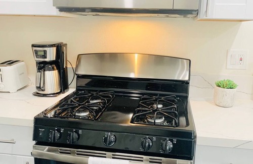 There are several grocery stores close by - Sprouts, Vons (both deliver), Gelson’s and Trader Joes. Many great restaurants close by. Our kitchen is stocked for cooking including a full size fridge and freezer, stove, oven, microwave, toaster, all cooking utensils, and even a gas grill on the patio!
