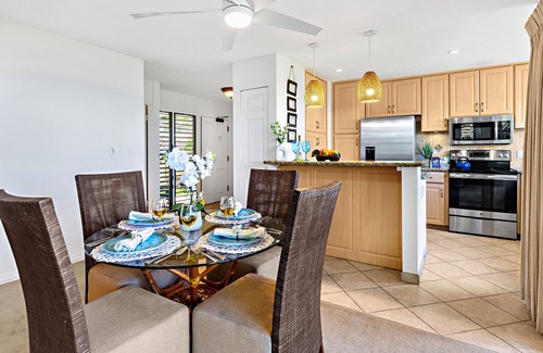 Ocean and island views create a serene backdrop on the expansive main lanai. Relax and enjoy meals al fresco on the lanai with a dining table for 4 and 2 lounge chairs. A dining table for 4 is equipped in the unit so you may enjoy the views from inside with large sliding doors and windows. The fully equipped kitchen features full-size stainless-steel appliances. A kitchen island provides ample counterspace making meal prepping a breeze.