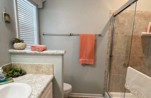 Kitchen has double door refrigerator for plenty of food storage, an open breakfast bar with stools, dining table seats 6, and all electric updated appliances. Both bedrooms offer queen size beds and storage for your clothing. Master bedroom has its very own private bathroom. Wifi throughout the home. Washer and Dryer is in its own closet in the hallway. Walk out the front door and enjoy a beautiful wrap around patio with wicker seating and tall table with barstools. The breeze from the water and the sight is absolutely breathtakingly beautiful. To get to the private board walk/fishing dock, simply walk a few steps across the narrow street and enjoy. Dock does have porch swing, picnic table, fish cleaning table and pole holders. Can also tie your boat off directly to dock. Weather your trip is for business or pleasure, This is definitely a vacation for the books and one you and your family will remember and be talked about for years to come.