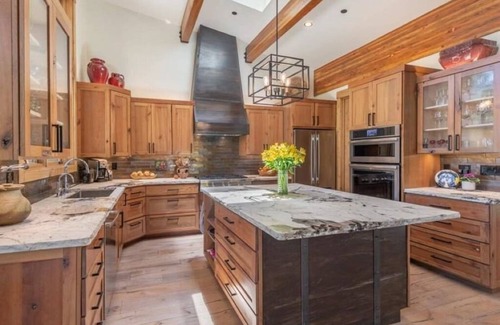Floor to ceiling windows frame the backdrop of the Sierra landscape with the gorgeous views surrounding the home. The open concept living room has soaring 22 foot + ceilings with floor to ceiling gas fireplace which is truly remarkable and our most favorite room in the house! Cozy furry blankets and pillows, cow hide rugs, elegant art and a large television for streaming your favorite shows. The adjacent chef's kitchen is complete with Jenn Air Appliances, six burner gas stove, warming drawer and large walk-in pantry and breathtaking leathered granite countertops and custom wood cabinets and barstools for two. This open concept floor plan and well furnished kitchen makes entertaining fun! Music on demand in every room with Alexa.