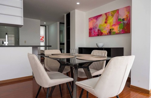 Tres habitaciones, dos baños, recibidor, sala, comedor, cocina perfectamente dotada, espacio amplios para disfrutar en familia . Dispone de parqueadero y todas las facilidades para tu estadía en Bogotá . Mobiliario y decoración de lujo