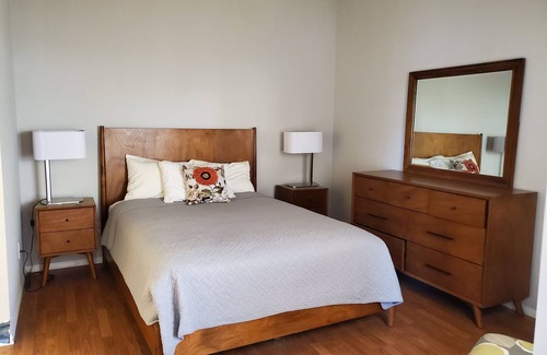 The living and dining areas are very spacious and thoughtfully laid out in an open concept. The beautiful high ceilings allow for excellent lighting and a cozy great-room feel. A rear slider opens to a lovely covered patio, and leads to a large back concrete patio and beautiful fenced back yard. The front door opens to the great room, with the master bedroom to the right, and second bedroom smartly positioned on the opposite end of the living space, to the left. The master and bath have walk in shower, queen bed, and are beautifully furnished. The 2nd bedroom has a full size bed and bath with tub/shower combo a few steps away. The home has laminate wood floors throughout. The roomy galley-style kitchen is well appointed with full size stainless frig, dishwasher and gas range, good storage and is professionally equipped for cooking and entertaining. A large storage/pantry/laundry room has full-sized washer & dryer. This lovely townhome is fully furnished in mid-century modern décor, complete with linens, towels -- a lovely turn-key vacation rental. Monthly rate is $1800 (preferred); weekly is $900. I am asking pet deposit $100, and cleaning fee $250. Longer stays require first & last month deposit. I have bed & breakfast in Oregon and am not able to enjoy the winter in Tucson this year.