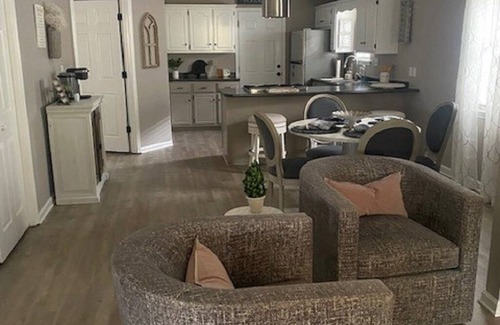 Kick back and relax in this quaint, stylish home. Newly renovated and comfortable open floor plan with flat.screen TV and dedicated work station. Fully stocked kitchen with double oven, microwave, air fryer toaster combo and full coffee bar. Four seat kitchen table plus three barstools seats seven total. Two bedrooms with king and queen beds and large flat screen TVs. Sofa also makes queen bed. Two full bathrooms. Nice peaceful patio with gas grill. Located in west Tupelo in a very quiet neighborhood.