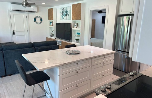 Stay comfortably in Treasure Cay at this 2-BR/2 BA, beachfront villa, with a beautiful, extended eating area. This newly renovated villa has two bedrooms featuring a soothing king bed and a welcoming queen bed, perfect for a good night's sleep. Enjoy the gorgeous surroundings and modern amenities like AC, WIFI, dishwasher, outdoor washing machine w/ dryer. Both bathrooms are equipped with showers. Guests will feel right at home. Enjoy the Beach Villa Amenities such as community pool, lounge chairs on the pool deck and the beach with Palapas! !You're sure to make fantastic memories with a stay at our place. Another villa is located just next door and is also available to rent in order to accommodate more guests at an additional rental fee.
