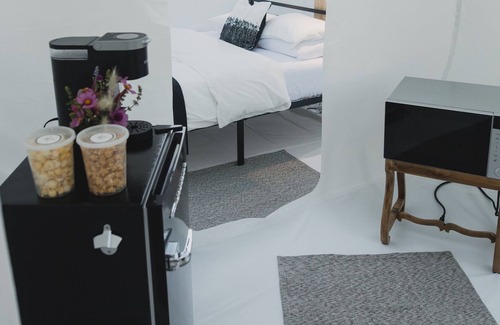 The dome contains air conditioning, mini fridge, coffee bar, and basic plates/utensils. You'll have access to water just outside of the door to rinse dishes.