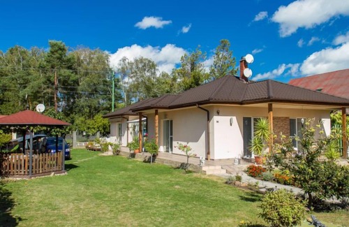 Balatonboglár: Modern, beautiful semi-detached house. In the resort, 150 m from the lake. For shared use: property 300 m2, well-kept garden (fenced) with lawn and flowers. Patio. In the house: WiFi, air conditioning, washing machine. Grocery 150 m, restaurant 50 m, grass beach 150 m. Please note: railway line closeby.