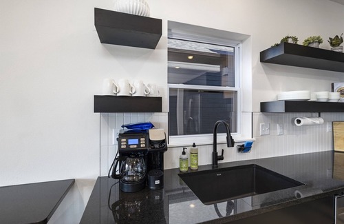 Take six steps up off parking right in front of the house into the main lighted entrance and look through the home to take in the lake views. Into the home the foyer has two bedrooms, the first is a primary bedroom Thuma king size bed, memory foam mattress, sit-to-stand desk with private en-suite bathroom. The second bedroom has another Thuma king size bed, memory foam mattress, and en-suite bathroom that is accessible from both the bedroom and the hall. Down the hall to the back of the house is the fully stocked kitchen for 28 with quartz countertops, a 10' Restoration Hardware dining table seating 12, and countertop seating for 9 more. The living room is right off the dining area and has a large sectional couch that takes in the lake views, enjoys the fireplace, and be entertained on the 85" Samsung TV. Out the sliding glass door to the patio there is a Weber grill, 14' of outdoor dining tables and chairs to accommodate fourteen, plus an outdoor sofa and coffee table to enjoy the brew with a view.