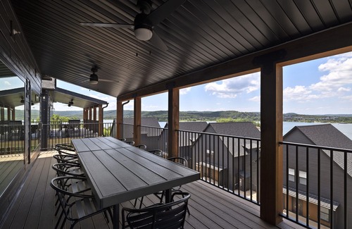 Take 3 steps up off parking right in front of the house into the main lighted entrance and look through the home to take in the lake views. Into the home the foyer has two bedrooms, the first is a primary bedroom Thuma king size bed, memory foam mattress, sit-to-stand desk with private en-suite bathroom. The second bedroom has another Thuma king size bed, memory foam mattress, and en-suite bathroom that is accessible from both the bedroom and the hall. Down the hall to the back of the house is the fully stocked kitchen for 28 with quartz countertops, a 6' round Restoration Hardware dining table seating 10, and countertop seating for 9 more. The living room is right off the dining area and has a large sectional couch that takes in the lake views, enjoys the fireplace, and be entertained on the 85" Samsung TV. Out the sliding glass door to the patio there is a Weber grill, 14' of outdoor dining tables and chairs to accommodate fourteen, plus an outdoor sofa and coffee table to enjoy the brew with a view.