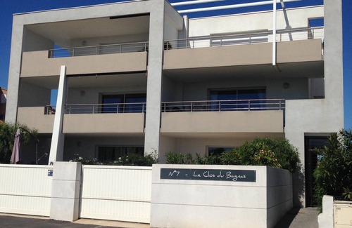 This ground floor apartment is part of a block built in 2012 located opposite the Etang de Thau and only 500m from the beautiful port of Marseillan. There are 2 double bedrooms, a bathroom, separate toilet and an open-plan kitchen/sitting room with French windows leading outside to a comfortable paved garden area/terrace with furniture for sunbathing, eating and relaxing.