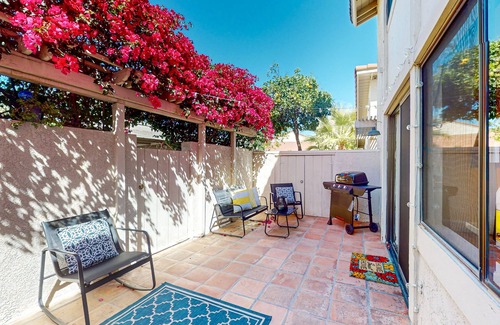 Upon entering this air-conditioned beauty, you are greeted by a bright and colorful living area with inviting sofas and nice open space. Spread out comfortably after a day in town and get ready for an entertaining evening at home playing numerous board games, puzzles, and more at your disposal. The condo also features a smart TV with streaming, local channels, and a DVD player for additional entertainment. The well-stocked kitchen enjoys all the major appliances needed to prepare tasty homemade meals and treats for the crew. Outside, the condo boasts an open patio in the front and a secluded patio in the back shaded by beautiful bougainvillea with seating and a gas grill - perfect for summertime barbecues! If you are lucky enough, you may pick oranges, lemons, and grapefruit present in abundance in the blooming season. Additionally, the outdoor lights are low in this beautiful resort community so you can enjoy and stargaze at the breathtaking skylights of Palm Springs. Extra perks include a washer/dryer and additional sleeping space for two downstairs.