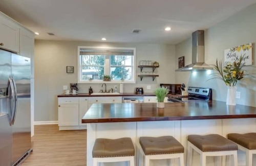 As you pull up to the home, you will park and enter the main entrance to the home. Entering the main door of the house will bring you into the fully updated kitchen with new shaker style cabinets, all necessary appliances including a refrigerator, dishwasher, microwave, toaster, coffee maker, oven, stove with overhead range hood, and all the essentials needed for preparing and serving meals at home. The kitchen has four stools at the bar, and an eat-in dining area, which is open concept to the living area. This open concept is perfect for entertaining and socializing with the entire family. The living area has a sofa bed, coffee table, end tables and lamps with a 50" Roku TV. High end finishes throughout the home will satisfy even the most discerning guests, with original terrazzo floors and spa-worthy floor-to-ceiling tiled walk-in showers. The very spacious master bedroom has a king bed, nightstands with lamps, and a small bench at the foot of the bed. The second bedroom is furnished with a queen bed, nightstands, lamps, and a luggage rack, the third bedroom has two twin beds with a shared nightstand and lamp and larger closet. The studio apartment is a tastefully converted and fully finished former garage, and is furnished with a small kitchenette with microwave and kitchen essentials, a queen bed, and two pull out sofa beds.