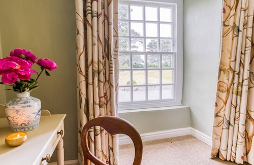 Bedrooms, with crisp linen and pretty fabrics have long green views over the stunning gardens and countryside. The colourful bedrooms are all different. Some are enormous, one has a wardrobe you could sleep in! Window seats for places to ponder and romantic panelled nooks to dwell in. No light pollution gives you starry skies and the peace nudges a healthy sleep. You'll find two large panelled big bathrooms in pastel shades with baths fit for a King or Queen. Plus, a deeply blue bathroom with a bath for an indulgent soak.