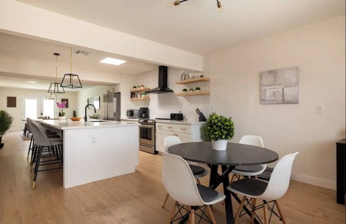 Designer Modern Luxury Villa! Meticulously remodeled with no expense spared! Less then 15 mins to Airport or the Strip! Gourmet chefs kitchen with modern Calcutta Quartz countertops, New stainless appliances. Open flow to dining room seating 8, kitchen seating 4 and relaxing living room, faux LED Fireplace and Smart TV. Free Garage Parking, oversized swimmers pool.