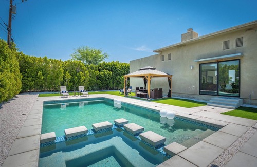 Fully renovated with brand-new appliances. Professionally furnished and decorated for the most discerning of guests. Stunning pebble-bottom pool and Jacuzzi with all-new custom landscaping. Private, well-lit backyard includes generous seating at gazebo for al fresco dining under the beautiful desert sky.