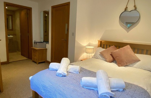 Our lovely house provides reverse accommodation! On the ground level there is an entrance hallway with storage and w.c off. This leads to the spacious open plan lounge diner with wall to wall windows front and rear. There are sea views to the front, and a delightful south facing decking area to the rear, ideal for lazy breakfasts and BBQ. The kitchen is modern and well fitted with all required integrated appliances, granite work tops and is stocked with top of the range kitchen appliances. There is oak flooring throughout on this level and excellent quality furnishings. The dining table comfortably seats 6 and we provide games, DVD's, books for your use. On the ground floor you will find 3 generous bedrooms each with doors leading out to patio garden areas. Bed 1 has a super kingsize bed, fully tiled en suite wet room. Bedroom 2 a double with fully tiled en suite wet room. Bedroom 3 a large twin room with fully tiled en suite wet room. Beyond bedroom 2 is a handy laundry room and store, ideal for drying off wet suits, surf boards etc and is furnished with washing machine and separate tumble dryer. The property provides 1 allocated car parking space but there is guest parking and plenty of parking in the hotel car park too.