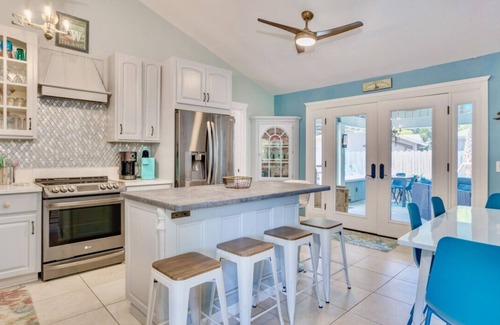 Before or after a day at the beach, the renovated kitchen has everything you need to fix delicious meals. Distinctive features of the kitchen are quartz counters, a glass backsplash (that shimmers like a mermaid tail), an island with a food grade finish concrete countertop, and a gorgeous mermaid light fixture. Feeding all of your guests is a breeze with stainless steel appliances (including a new fridge with two ice makers), pots and pans, cooking utensils and ample counter space to prep. Inside dining options include a modern white table with four ocean teal chairs and four stools at the kitchen island. There is also a table and chairs (seats four) in the screened in porch and a table with six comfy C-Spring chairs on the deck outside.