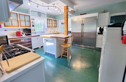 First floor: Here you will enjoy the well-equipped kitchen, formal dining room, large living room and 3/4 bathroom (shower). The large spacious kitchen is well equipped for preparing big meals with two coffee makers, a huge refrigerator, and an equally large freezer, plus an island for socializing, the kitchen is large enough for folks to ‘hang out’ while preparations are underway. The living room has a brick fireplace and several furniture groupings offering plenty of space for conversations and indoor activities such as puzzles, board games, and WiFi. Mementos from the current owners as well as historic pieces from over a century of visitors, this cottage welcomes you to come right in and make your own memories!