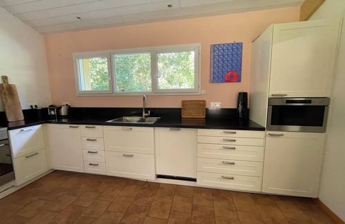There are four bedrooms of which two have their own bathroom with a shower and the other share a bathroom with a bath and shower. All beds are new and of high quality. The open space has a dining table for 12 people, a large open kitchen with a wide oven and american fride. There is a fire place with a large sofa and a TV. Connected to the kitchen, there is a storage room with a washer, drier and additional small fridge.