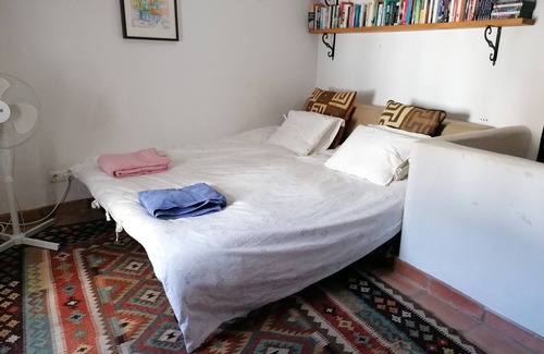 This beautiful village house has been lovingly restored to retain all the features of a traditional Spanish home - wooden beams, terra cotta floors and open fireplace. The house comprises a large (20 m2) fully equipped kitchen/dining room on the ground floor, from where a flight of stairs lead up to the open plan, comfortably furnished living room, which has a sofa bed. A few steps up take you to the bathroom, with full sized bath and a large, separate shower cubicle. A few steps more lead to the large (20 m2), light and airy bedroom with built-in wardrobe and wooden floor. From the bedroom there is a further flight of stairs up to the spectacular sun room and terrace with wonderful views of the lush valley and the blue Mediterranean. The sun room also has a wooden floor and is equipped with its own fridge, crockery, pots and pans, with cooking facilities on the terrace. The house is situated on a quiet village street, easily accessible by car. Bars, shops, restaurants and municipal pool are within easy walking distance.