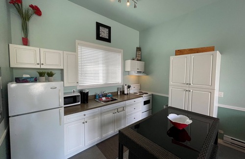 Roll up the garage door and let the outside in! This unique and cozy guest suite is surrounded by towering cedar trees and has easy access to Mara Lake.