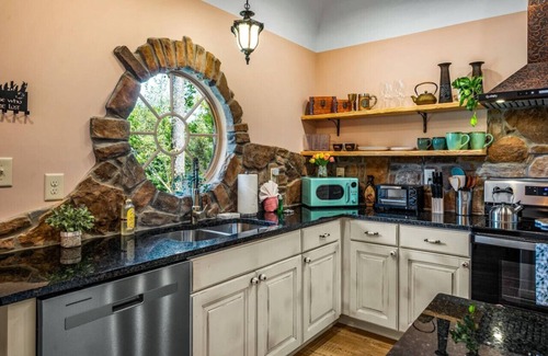 As you walk down the stone path toward the front door, you are greeted by wildflowers along a rustic wood fence and wind-spinners. These earthen burrows have lovely wildflowers and clover on their rooftops above the intricate stone work, circular windows and arched doorways that invite you to explore within. Upon entering (on “party business” only, of course), you are welcomed by the large, live-edge solid wood dining table next to the gourmet kitchen complete with all the creature comforts of home, including a slow cooker, rice-maker, blender, and everything you need to whip up a yummy breakfast – perhaps even a SECOND breakfast. Glance above and notice the arched ceiling uniquely decorated by natural tree log beams, along with rustic chandeliers to brighten the enclave.