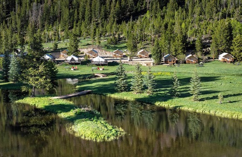 Glamping Tent 2 is situated in Miners Camp, right next to Little Indian Lake, and just a short walk from the Lodge and The Red Dog Saloon. Nearby, you'll find a bathhouse with private rooms that include hot showers, flushing toilets, and sinks for your convenience.