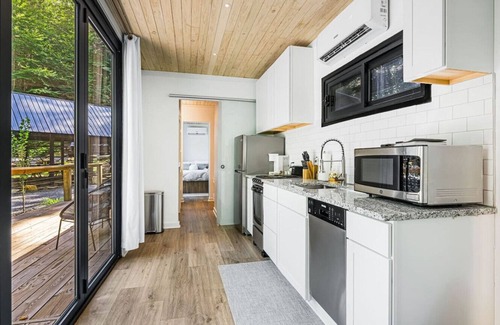 This unit is next to our other unit “Elevation” and can be booked together for a larger space. Common area with fire pit, hot tub, eco-gardens, nature trail, close to Panther Branch take out of Little Tennessee River.