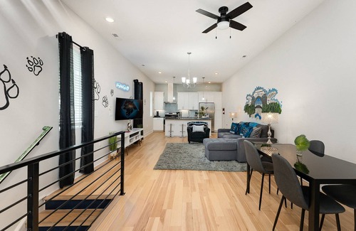 Welcome to the Panthers Den! A lovely two bedroom, Panthers-themed pet friendly home, with bold wall murals, luxury furnishings, and city views. All within a 10-minute walk to Bank of America Stadium, Charlotte FC matches, Spectrum Center concerts, and uptown nightlife and restaurants, this home is perfect for anyone with a small to medium-sized group or family visiting Charlotte and looking for a unique home with a perfect location!