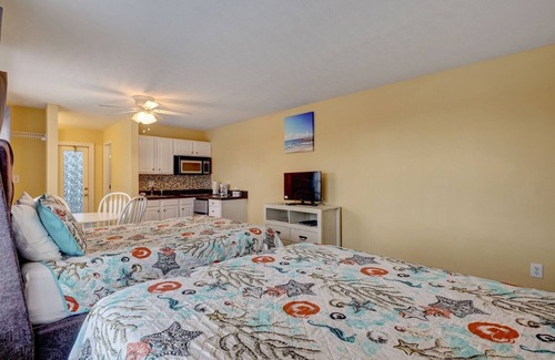 Welcome to your coastal retreat, a charming condo nestled just steps away from the sun-drenched shores of the ocean. As you step through the door, the soothing sound of crashing waves and the salty breeze greet you, instantly whisking you away to a world of seaside serenity. Cozy living area that seamlessly transitions into a well-equipped kitchenette. Warm, earthy tones adorn the walls, creating a welcoming ambiance that invites you to unwind and relax after a day of coastal adventures. The kitchenette features appliances, including a compact refrigerator to keep your favorite snacks and beverages chilled, a microwave for quick and easy meal preparation, and a coffeemaker to brew a fresh cup of joe to kickstart your mornings. With its prime location near the ocean and array of thoughtful amenities and two queen-size beds, this charming condo offers the perfect blend of comfort and convenience for a memorable coastal getaway with loved ones.