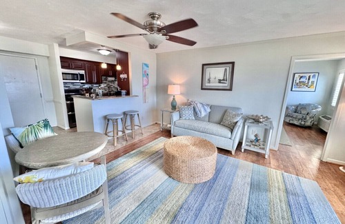 This updated unit features a fully equipped kitchen with custom cabinets, granite countertops, and stainless steel appliances. The breakfast bar and vinyl plank flooring make it a nice space for your beach vacation.